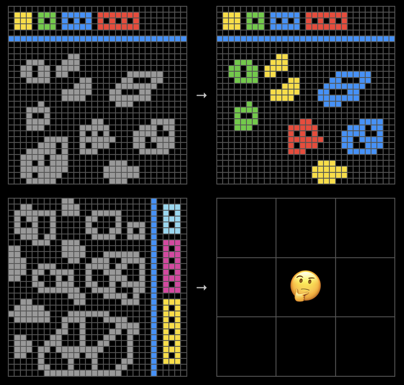 The task is to extrapolate from the examples on top to figure out what the missing image is. Spoiler alert, the shapes get colored based on how many holes they have in them, and shapes with a hole count that doesn’t match the color key are deleted. This reminds me of IQ or standardized test puzzles, and if you know anything about AI models you can picture it having been historically very hard.